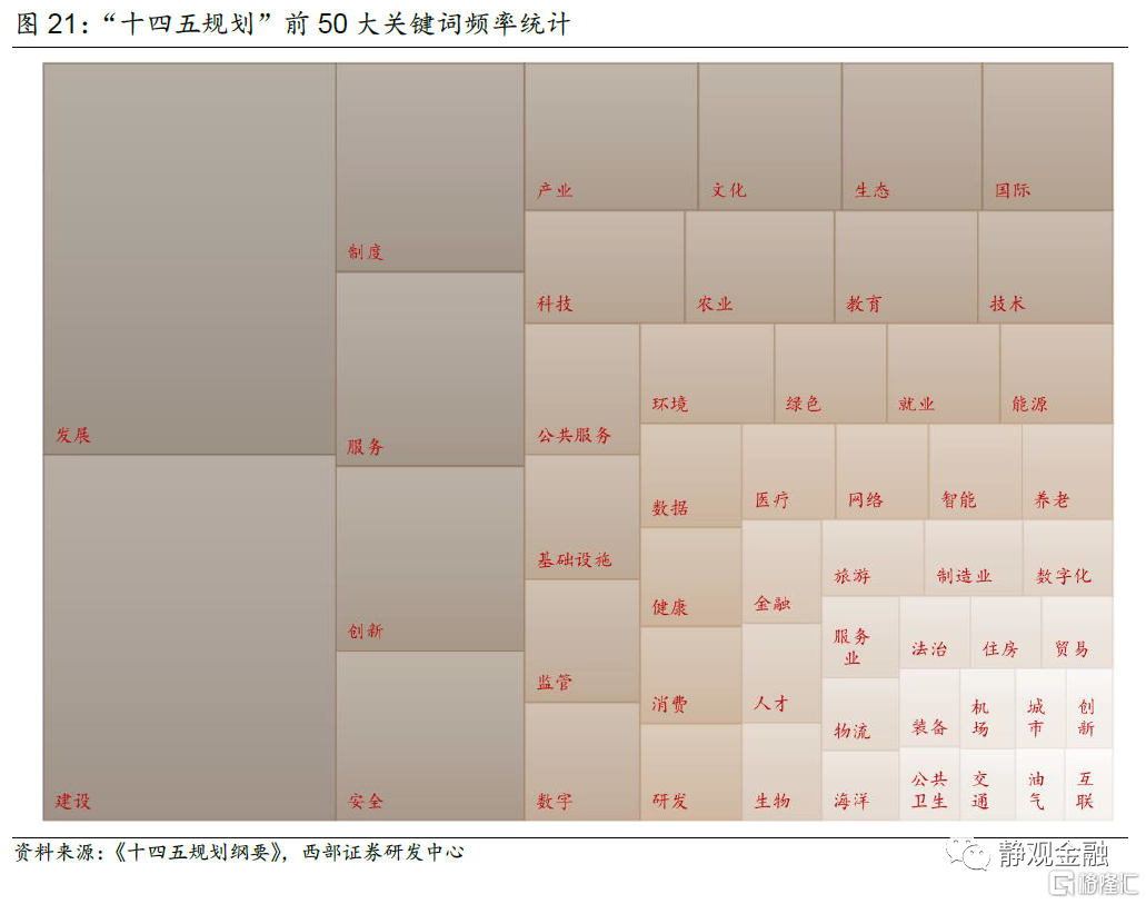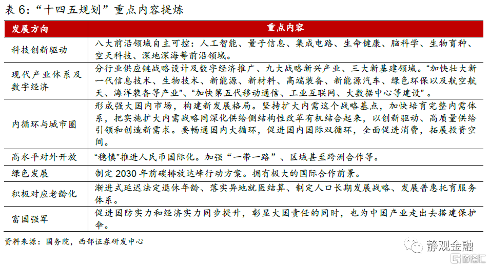 “十四五規劃”分爲19篇、65章、147頁,前50大關鍵詞中與產業相關的有網絡、教育、基礎設施、金融、數據、科技、醫療、消費、住房、節能。“十四五規劃”提出科技創新驅動、現代產業體系及數字經濟、內循環與城市圈、高水平對外開放、綠色發展、積極對應老齡化、富國強軍七大發展戰略,重點內容可歸納爲六個關鍵詞:自主可控、數字經濟、綠色經濟、雙循環、應對老齡化、富國強軍。