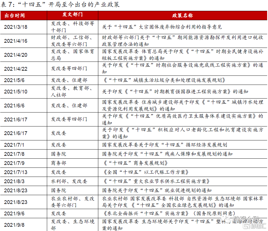 “十四五規劃”的政策基調如何?1)“十四五規劃”定調:重點內容可歸納爲六個關鍵詞:自主可控、數字經濟、綠色經濟、雙循環、應對老齡化、富國強軍。2)產業政策:“十四五”開局至今已出臺38條產業政策,鼓勵綠色與智能製造、促消費、公共事業。