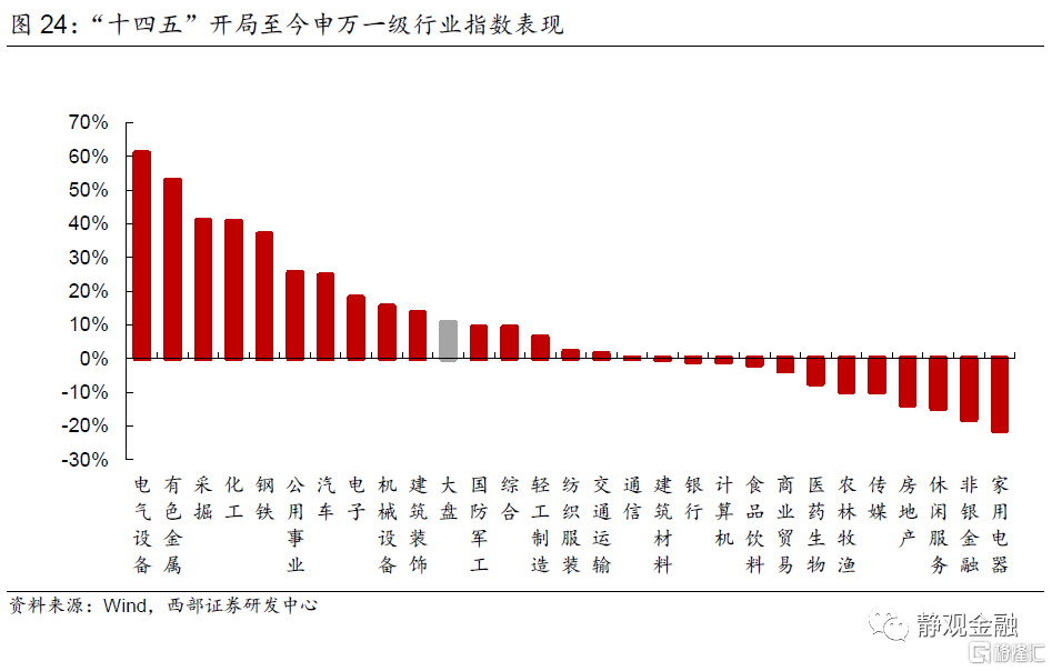 “十四五”開局至今萬得全A年漲幅10.7%,申萬28個行業指數漲跌參半。其中領漲的前10大行業爲電氣設備(60.9%)、有色金屬(52.9%)、採掘(40.8%)、化工(40.6%)、鋼鐵(36.8%)、公用事業(25.5%)、汽車(24.6%)、電子(18.0%)、機械設備(15.5%)、建築裝飾(13.4%)。基於相關產業政策的密集出臺,今年是電新和週期股的春天,背景是能源革命。此外,疊加擔憂“舊經濟”的情緒,市場呈現成長風格並伴隨中小市值的選股風格。