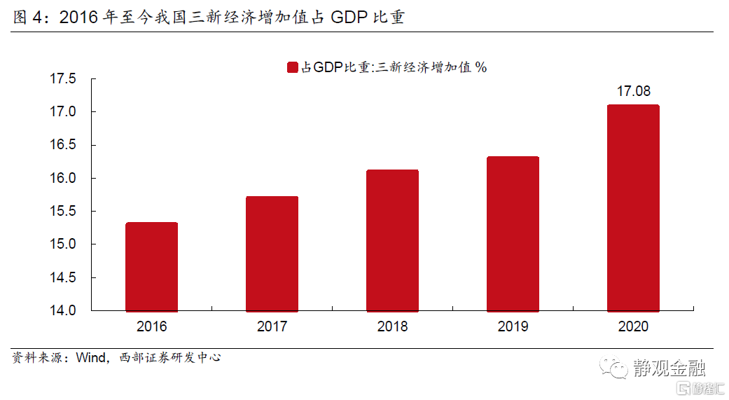 4)“十三五規劃”提出“加快發展現代農業,推進農村一二三產業融合發展”,工業要“推進供給側結構性改革,培育壯大新興產業,改造提升傳統產業”,並“加快推動服務業優質高效發展,推動生產性服務業向專業化和價值鏈高端延伸、生活性服務業向精細和高品質轉變”。因此“十三五”期間第一產業佔比由8.4%降至7.7%,第二產業佔比由40.8%降至37.8%,第三產業佔比由50.8%升至54.5%。此外,“十三五”期間三新經濟[1]增加值佔GDP比重由2016年的15.3%升至2020年的17.1%,表明此間產業升級和融合在加快。