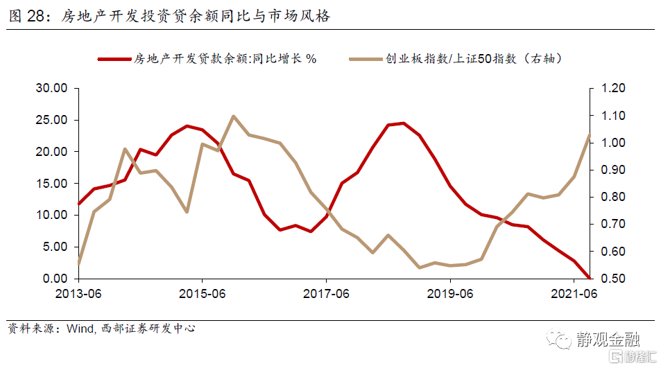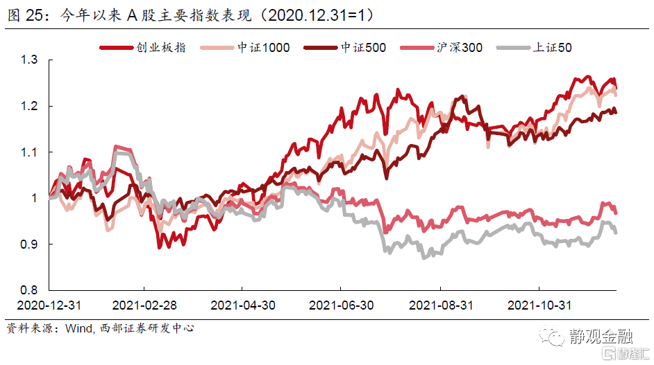 進一步觀察,我們不難發現今年Q2上證50指數與滬深300指數的“含寧部分”與創業板、中證1000指數以及中證500指數的“含寧部分”表現相當,但8-11月則有所分化,表明此間市場在新能源主題下進一步演繹了成長風格、大小分化加劇。表面看,這一分化剛好對應了無風險利率中樞下移,但結合前文可知,這種分化的驅動力爲宏觀因素,我們認爲與市場對於地產乃至經濟下行的擔憂有關。