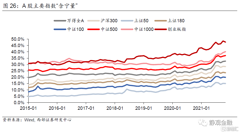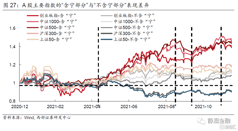 而今年市場的成長風格乃至中小市值下沉的選股特徵亦是由於新能源這條市場主線。今年表現最好的創業板、中證1000指數以及中證500指數的“含寧量”(含有新能源及其概念股的比重)顯著高於今年表現較差的上證50指數與滬深300指數。進一步看,我們將上述指數進一步拆分成“含寧部分”與“不含寧部分”。結果顯示,創業板、中證1000指數以及中證500指數的“含寧部分”要顯著好於“不含寧部分”;上證50指數與滬深300指數中“含寧部分”表現不僅明顯強於其“不含寧部分”甚至也跑贏了創業板、中證1000指數以及中證500指數的“不含寧部分”。