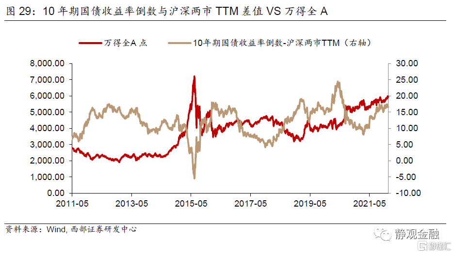 我們在此前報告中提到當下到明年上半年,國內貨幣將更以我爲主、持續寬貨幣概率不低,結合下圖可知該因素大概率是利好股市的。目前10年期國債收益率倒數與滬深兩市TTM差值處於過去十年的高位(截至12月17日爲2011年5月以來的90.5%分位數),可見股票性價比明顯高於債券。覆盤來看,此時股市上漲概率顯著高於整體下跌,大幅下跌的可能性不大。換言之,假若貨幣政策進一步寬鬆,股市大概率更爲受益。從風格上看,今年的主線是新能源,在此背景下形成了抱團特徵、成長風格並伴隨着中小市值下沉的選股方式。假若明年該趨勢有所弱化,而貨幣政策進一步寬鬆、市場主題擴散,則A股也有望趨於均衡。