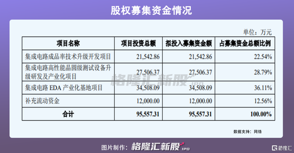 本次IPO擬募資9.56億元,主要用於集成電路成品率技術升級開發項目、集成電路高性能晶圓級測試設備升級研發及產業化項目 、集成電路 EDA 產業化基地項目以及補充流動資金。