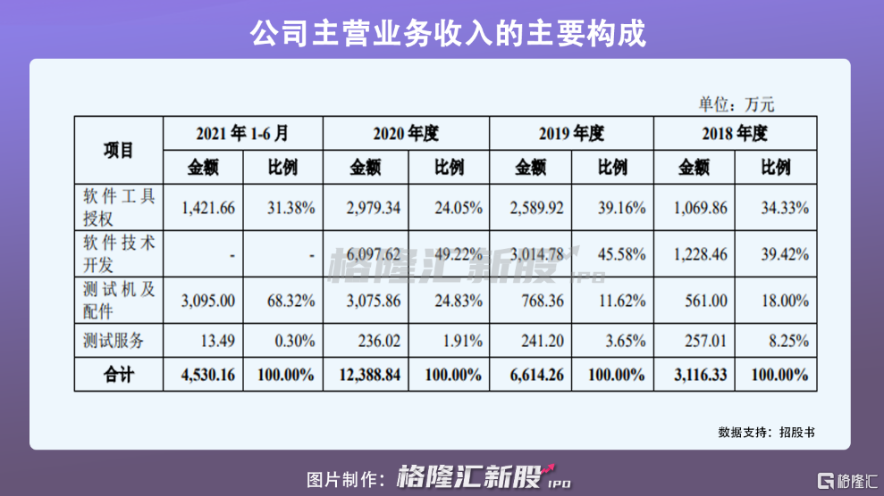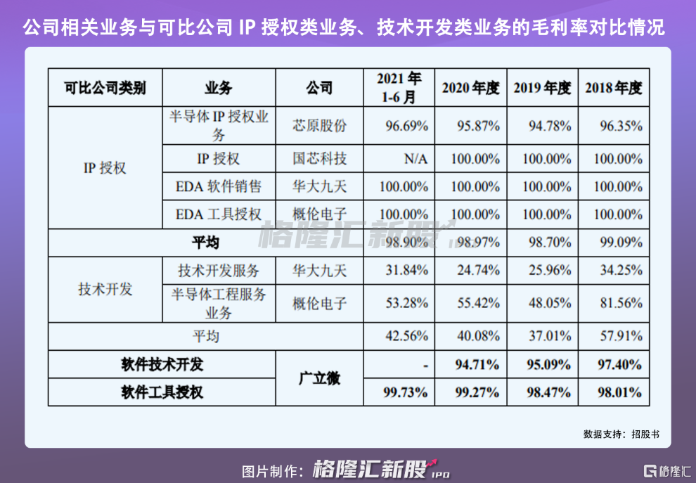 此外,廣立微的綜合毛利率分別爲 91.62%、92.02%、85.25%、 70.46%,存在一定的波動。例如,2020 年度,公司毛利率相較前一年度有所下降,主要原因系隨着公司推出的第四代晶圓級電性測試設備獲得市場認可,與 EDA 軟件業務相比毛利率較低的測試機與配件業務高速發展,當年收入達 3075.86 萬元,同比增長300.31%,因此公司綜合毛利率有所降低。