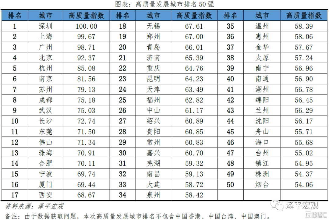 從榜單結果看,深圳、上海、廣州、北京位居2020年城市高質量發展前四名杭州、南京、蘇州、成都、武漢、長沙位居前十,西部、東北地區城市居後十。2020年城市高質量發展前50名中,深圳佔據榜首,上海、廣州以較小的分數差距緊隨其後,北京與前三名分差稍大位居第四名,主因是對年輕人落戶不友好、市場化水平不及南方、空氣質量雖大幅改善但仍較差等。