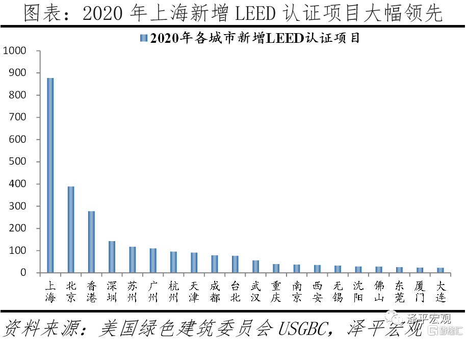 2)上海:綠色發展先驅城市,以製造、建築、交通等碳排放主要來源行業作爲首要突破點,同時積極推動綠色生活、發展綠色金融。製造、建設、交通是碳排放的主要來源,上海在綠色發展維度全國領先,主要是因爲其將綠色製造、綠色建設、綠色交通作爲突破點,同時推動綠色生活、發展綠色金融。工業領域,聚焦產業結構優化和能效提高,2020年萬元GDP能耗同比下降6.6%,節能減排工作在全國排名第二。建築領域,作爲綠色建築起源城市推動綠色建築發展,以被全球廣泛認可的綠色建築和城市認證體系(LEED)爲例,2020年上海以677個認證項目居全國第一,遠高於第二名北京。交通方面,積極推廣新能源汽車,出臺《上海市鼓勵購買和使用新能源汽車實施辦法》,2021年上半年新能源汽車累計推廣量居全球城市前列。生活方面,上海在全國率先出臺實施《生活垃圾管理條例》,2020年有害垃圾日收運量同比增長超三倍。金融方面,作爲金融中心將綠色上升到資本與交易,一方面作爲碳排放權交易市場首批試點城市積極發展碳金融;另一方面持續發展綠色金融,2021年發佈《上海加快打造國際綠色金融樞紐、服務碳達峯碳中和目標的實施意見》,在全國率先提出構建完整綠色金融生態體系。
