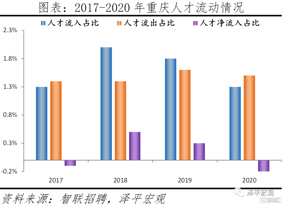 1)重慶:高質量發展第22名,綠色發展得分居全國第9,2015-2020年碳排放強度下降超22%,優於全國水平;但2020年人才淨流入佔比爲負,人口潛力相對較低。從長江生態治理看,重慶實施長江流域禁捕和退捕漁民轉產製度,將捕魚人轉化爲護漁人;創新實施“雙總河長制”,由市區鎮一把手同時擔任“雙總河長”進行巡河、作業、清理垃圾等工作;率先展開“林長制”試點、率先推動森林覆蓋率指標區縣間橫向交易等。2020年重慶42個國考斷面水質優良比例首次達100%,優於國家考覈目標4.8個百分點,較2015年上升14.3%。從綠色低碳看,重慶率先將碳排放管理納入環境影響評價和排污許可,率先形成覆蓋碳履約、碳中和、碳普惠等各領域的“碳匯+”生態產品價值實現機制,2015-2020年碳排放強度下降超22%,高於全國下降幅度,但在傳統產業節能降耗上仍存在綠色製造基礎能力不夠、創新投入不足等短板。在人口潛力上,重慶2020年常住人口總量雖是全國第一,但近十年常住人口年均複合增速緩慢,2020年人才淨流入佔比爲負,這主要是由於重慶城市品牌宣傳、人才政策力度不及其他城市。