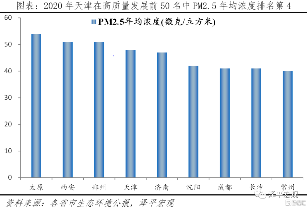 2)天津:高質量發展排名24位,通過科教資源、創新平臺推動原始創新和自主創新,以智能科技和數字技術爲先導,創新發展水平居全國第13,但綠色發展表現欠佳,2020年PM2.5平均濃度遠高於前50名平均水平。創新發展方面,天津在原始創新和自主創新發力,利用180個創新研發機構、50多所大學及企業進行原始創新,通過建設合成生物國家技術創新中心、中科曙光國家先進計算產業創新中心等創新平臺突破核心技術。同時,天津發揮傳統工業城市工業產業門類齊全、產業鏈成熟完整優勢,以智能科技和數字技術爲先導,融合科技創新與產業發展。如圍繞裝備製造、汽車、石油化工、航空航天等重點優勢製造業,天津進一步開發高檔數控機牀、工業機器人、金屬材料3D打印裝備等智能裝備,攻克節能汽車、新能源汽車、智能網聯車的核心技術,使製造業與科技創新協同發展。綠色發展方面,由於產業構成上,第二產業佔比34.1%,鋼鐵等傳統製造業佔比大,重化工業和高污染行業聚集,高能耗、高污染成爲天津綠色發展的挑戰。2020年 PM2.5平均濃度爲48微克/立方米,遠高於高質量發展前50名31微克/立方米的平均水平。