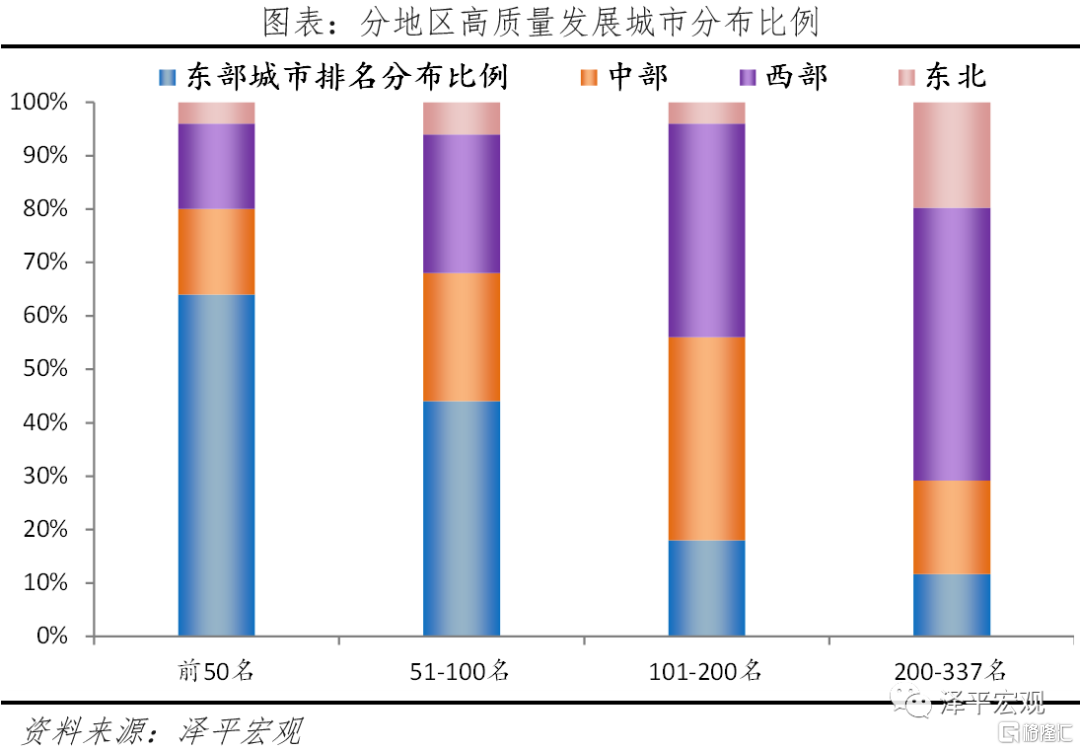 1)分地區看,前50名中,南方以佔據榜單39席的成績碾壓北方;東部地區以32個城市上榜的絕對優勢領先於其他地區;東北地區75%的城市位於200名之後;南北差距已經取代東西差距,成爲中國主要的地區差距。按傳統的南北方自然分界線來劃分,在高質量發展城市50強中,南方上榜城市有39個,佔比78%,以碾壓性優勢勝出,南北方城市在高質量發展水平上有較大差距。按四大地區看,東部地區憑藉雄厚的發展基礎、極高的戰略定位有32個城市上榜,佔榜單的64%,以絕對優勢領先;得益於中部崛起、西部開發的戰略定位,中部、西部地區各有8個城市上榜,各佔據榜單16%,東西差距小於南北差距;東北地區僅有2個城市位列前50名,而位於200名之後的城市佔東北地區城市數的75%,經濟不斷衰落使其高質量發展缺乏基礎動力。