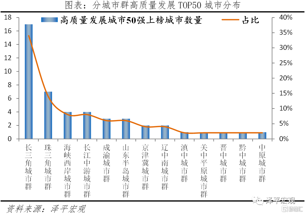 3)分城市羣看,高質量發展排名50強中近8成地處發展成熟的六大城市羣,其中長三角、珠三角城市數量佔比48%。整體看,長三角、珠三角城市羣高質量發展水平顯著高於長江中遊、海峽西岸、成渝、山東半島城市羣,長三角、珠三角、長江中遊、海峽西岸、成渝、山東半島城市羣進入高質量發展50強的城市數量分別爲17、7、4、4、3、3個,佔各城市羣城市總數的65.4%、77.8%、14.3%、36.4%、18.8%、18.8%;長三角、珠三角城市數佔榜單前50名的48%。從長三角城市羣看,長三角相對其他城市羣經濟發展最活躍、人民生活幸福感最高,前50名中長三角經濟人口比值1.73、城鎮居民人均可支配收入60678.7元,明顯高於其他城市羣。從珠三角城市羣看,珠三角在人口方面有明顯優勢。珠三角人口更年輕、人才吸引力更強,勞動年齡人口平均佔比爲75.5%,而其他城市羣均低於70%;人才淨流入比例平均爲0.5%,其他城市羣均低於0.4%。