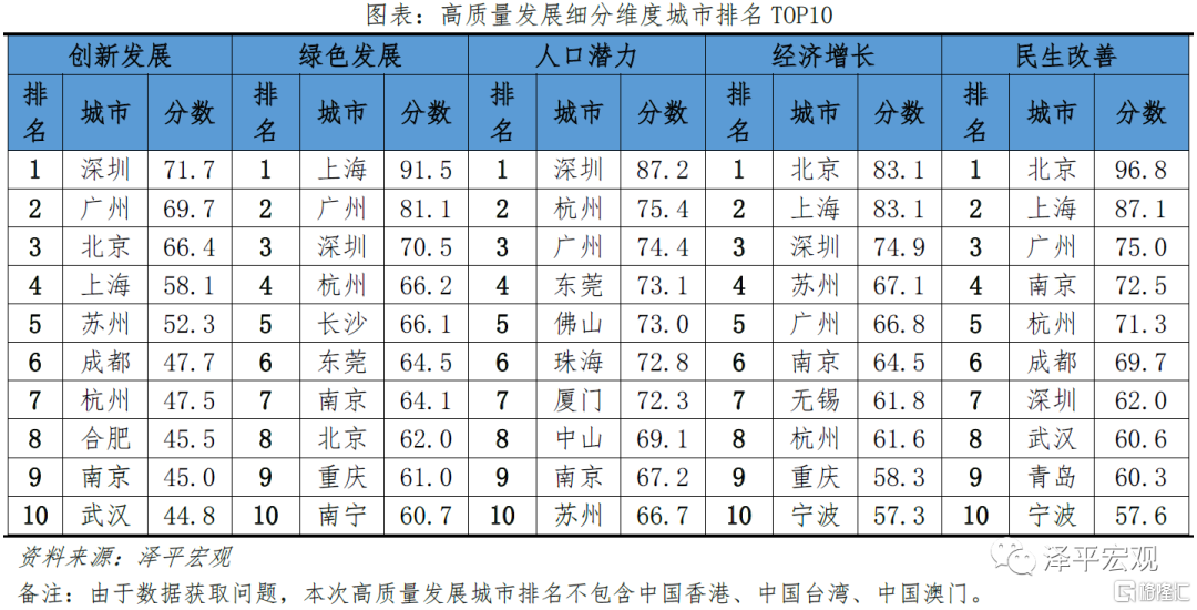 3.1 TOP10一線城市:深圳人口潛力、創新發展居首,上海爲綠色發展先驅城市