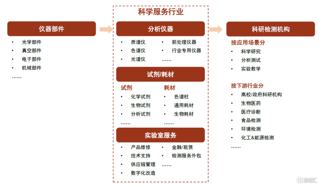 分析儀器是用於測定物質組成、結構等特性的儀器,屬於廣義的科學服務行業範疇。分析儀器產業鏈位於行業中游,上游主要為各類儀器部件,包括光學部件、真空部件、電子部件、機械部件等,下游則應用於高校、政府、第三方檢測公司以及各類工業生產企業的科研、檢測與教學活動中。從中游來看,分析儀器可與試劑耗材、各類實驗室服務相互配套,進而為下游提供完整的科學服務綜合解決方案。