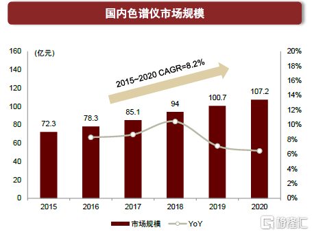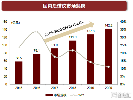 行業空間廣闊,質譜儀與色譜儀為“皇冠上的明珠”。分析儀器用於測定物質組成、結構等特性,被廣泛用於學術、製藥、食品、環境等領域。其中,質譜儀和色譜儀分別用於物質的精確測定和分離,為量大面廣、技術難度高的尖端通用儀器。從市場空間看,根據SDI數據,我們估計我國分析儀器2020年行業規模約656億元,其中質譜儀、色譜儀約為142、107億元,過去五年年均複合增長率約為19.4%、8.2%。