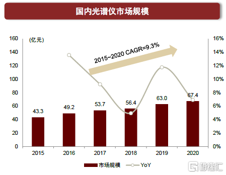 分類別看,國內質譜儀、色譜儀、光譜儀2020年市場規模分別為142、107、67億元。在各類分析儀器中,質譜儀、色譜儀、光譜儀量大面廣,被廣泛地用於各行各業的物質檢測及化學成分分析。根據智研諮詢、華經產業研究院數據,2020年國內質譜儀市場規模約為142.2億元,2015~2020年CAGR為19.4%;2020年國內色譜儀市場規模約為107.2億元,2015~2020年CAGR為8.2%;2020年國內光譜儀市場規模約為67.4億元,2015~2020年CAGR為9.3%。