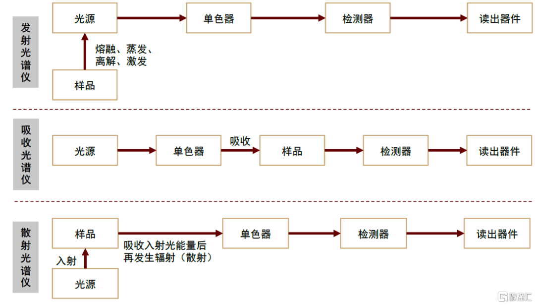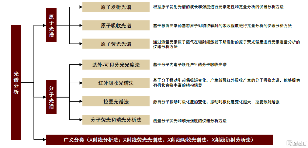 光譜儀是進行物質結構與成分分析的基礎儀器。光譜儀又稱分光計,其原理為,通過物質與光的相互作用,並對形成的光譜線進行分析,由於不同物質具有不同的光譜特徵,進而光譜儀可探測出物質結構和物質成分。光譜儀被廣泛應用於冶金、地質、石油化工、環境保護、生命科學等行業。其細分品類包括原子光譜、分子光譜、X射線光譜等。與質譜儀相比,光譜儀相對操作與流程簡單,測試速度快,並且大多數無需破壞樣品,價格也較為低廉,但整體上在檢測的精度、可靠性、檢測範圍上與質譜儀存在明顯差距。