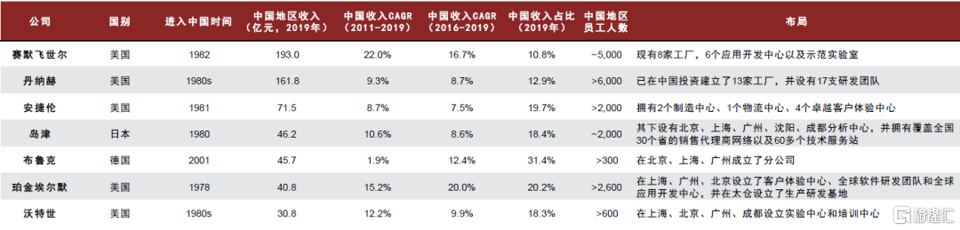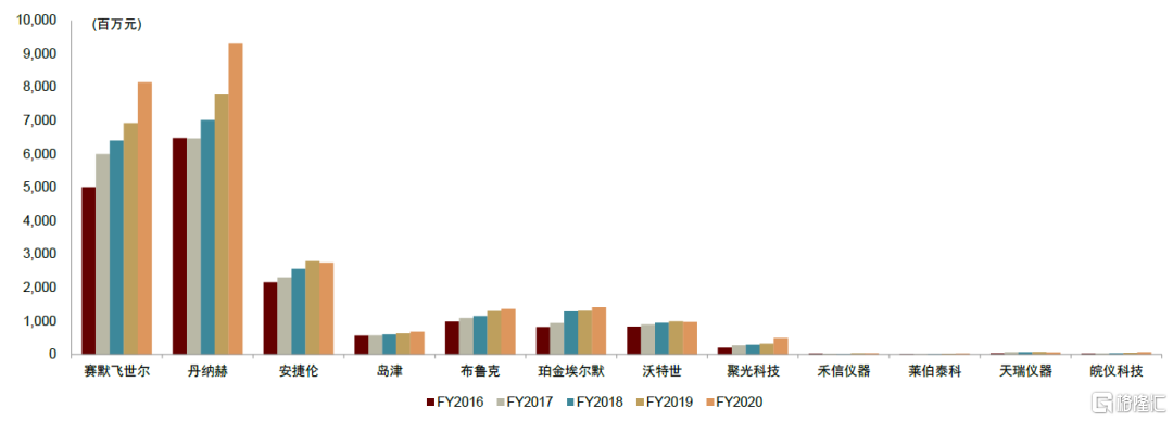 資料來源:Capital IQ,公司公吿,公司官網,中金公司研究部 注:為排除2020年疫情影響,財務數據使用2019年;安捷倫、島津為財年數據,非日曆年;布魯克為亞洲地區收入;安捷倫2011-2019CAGR數據缺失,以2013-2019CAGR作為替代