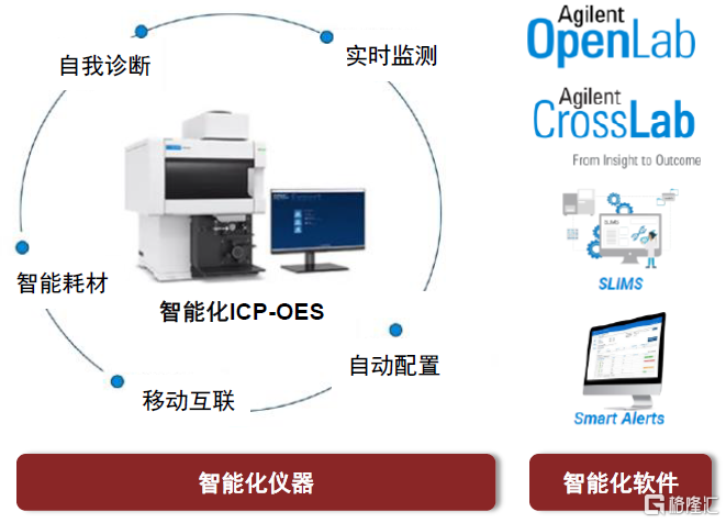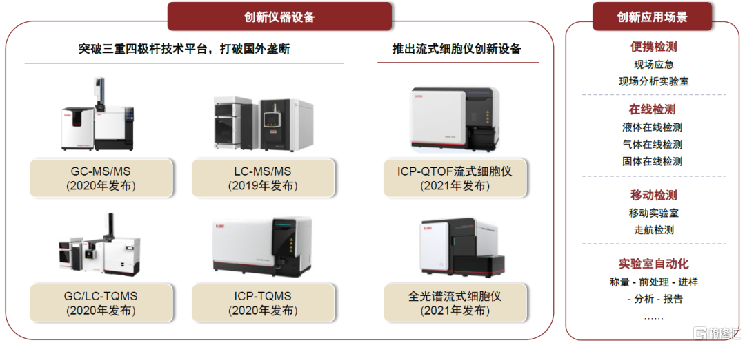 ►ICP-MS:電感耦合等離子體質譜儀。通常以ICP作為離子源,四極杆(或三重四極杆、四極杆-飛行時間)作為質量分析器。主要應用於無機元素分析,例如環境監測領域的金屬元素污染、醫療檢測領域的人體常量/微量元素檢測、半導體領域的金屬元素污染檢測、冶金領域的材料分析等。其特點是有很低的檢出限(達ng/ml或更低),基體效應小,譜線簡單,能同時測定許多元素,動態線性範圍寬。1994年安捷倫首次推出台式ICP-MS,國產企業中佈局較快的包括譜育科技、萊伯泰科、鋼研納克、天瑞儀器、禾信儀器等。