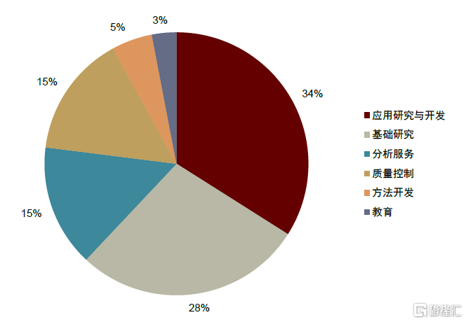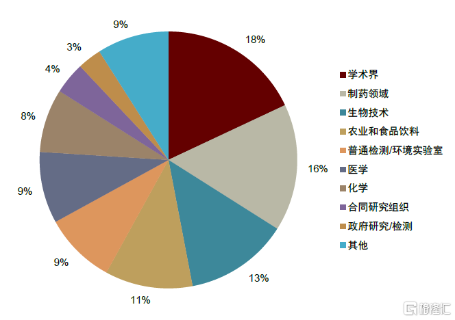 依託於研發、分析、質控等場景,分析儀器在學術/製藥/食品/環境等領域得到廣泛應用。根據SDI在2017年對於中國分析儀器市場的調查研究,從使用場景看,研發活動(包括應用研究與基礎研究)佔分析儀器應用的62%,分析服務、質量控制則各佔15%;從下游行業看,分析儀器被廣泛應用於學術、製藥、生物、食品、環境、醫學、化學等領域,佔比分別為18%、16%、13%、11%、9%、9%、8%。