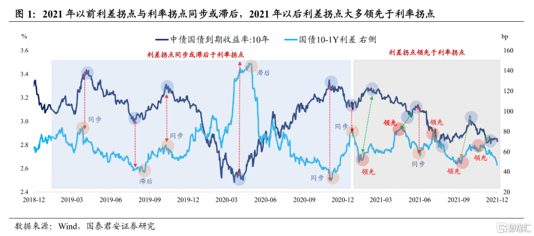 比如,2021年2月初,國債10-1Y期限利差收窄到40bp,央行突然收緊的貨幣政策讓市場對資金面的悲觀預期達到頂點,利率曲線極致平坦,利差拐點提前出現,但利率拐點卻在春節後才出現,且彼時市場還在等待熊市的“最後一跌”;再比如9月份,市場對年內再次寬鬆的預期已經打的很低,國債10-2Y期限利差收窄到34bp的“極致”,利差拐點提前出現,而利率的拐點卻在10月中旬才出現。