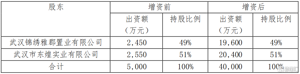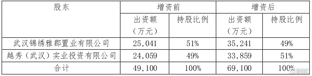 公司全資子公司錦繡雅郡與合作方經友好協商,共同對武漢錦秀嘉合置業有限公司(“錦秀嘉合”)同比例以自有資金進行增資,錦秀嘉合增資前註冊資本4.91億元,增資後註冊資本6.91億元,其中錦繡雅郡增資額1.02億元。增資前後情況如下: