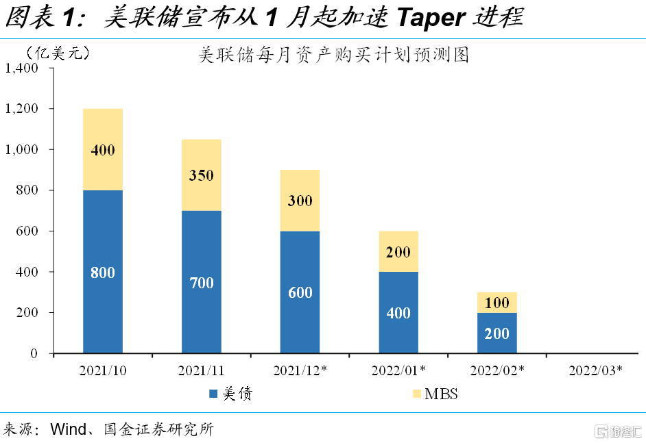 12月會議中,美聯儲宣佈加速Taper,點陣圖暗示明年或將加息3次,指向政策立場加速轉“鷹”。12月16日凌晨,美聯儲公佈最新議息聲明,宣佈從1月起,每月減少購買200億美元的美債和100億美元的MBS(目前是每月減少購買100億美元的美債和50億美元的MBS)。主席鮑威爾明確表示,本輪Taper結束與加息的間隔會比上個週期更短。最新點陣圖中,2/3的官員預計明年至少加息3次。顯而易見,政策立場正加速轉“鷹”。