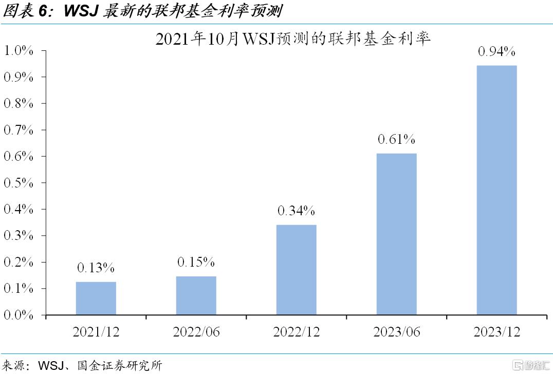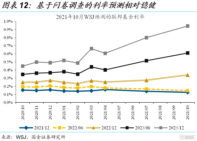 此外,WSJ等部分權威機構的問卷調查,也反映美聯儲加息預期明顯升温。部分機構也會公佈基於調查的聯邦基金利率預測,也常被作為觀測加息預期的指標。以WSJ(《華爾街日報》)為典型代表。WSJ會向70餘位經濟學家發佈問卷調查,其中就包含最新的聯邦基金利率預測。最新的2021年10月調查結果顯示,WSJ預計明年底聯邦基金利率為0.34%(當前為0.08%),換言之,美聯儲明年或將至少加息1次。