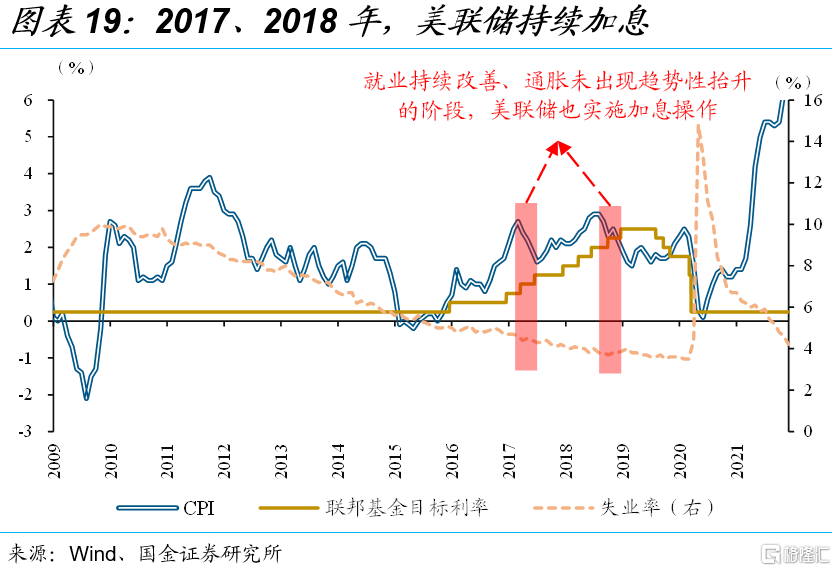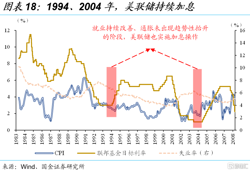 迴歸本源,影響美聯儲加息節奏的核心經濟變量是就業。追根溯源,美聯儲的政策目標是就業最大化及物價穩定。其中,因為就業對美國經濟基本面及通脹壓力的刻畫(菲利普斯曲線理論)更加穩健,而通脹時常容易受非經濟因素(地緣衝突)的干擾,美聯儲對就業的重視程度往往更高。結合美聯儲歷次加息時所處的宏觀環境來看,只有就業均處於大幅改善狀態,通脹或其他變量的表現不一。例如,1994、2004、2017、2018年,儘管美國通脹壓力階段性緩解,但因為就業市場持續改善,美聯儲連續實施加息操作。