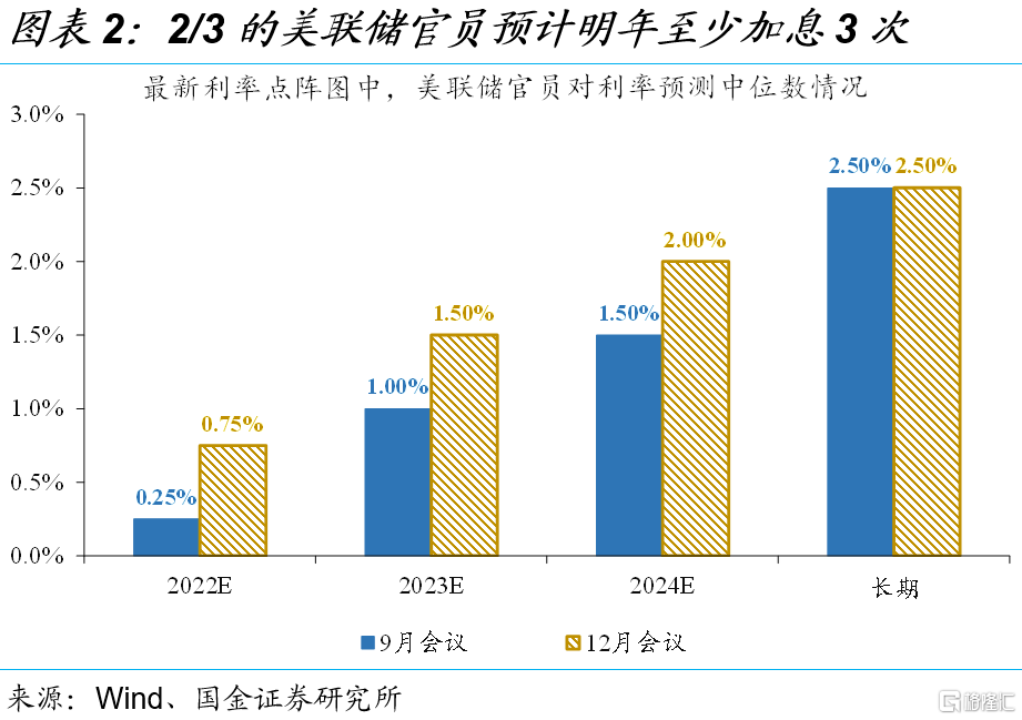 12月會議中,美聯儲宣佈加速Taper,點陣圖暗示明年或將加息3次,指向政策立場加速轉“鷹”。12月16日,美聯儲正式宣佈明年1月起加速Taper,主席鮑威爾明確表示,本輪Taper結束與加息的間隔會比上個週期更短。點陣圖顯示,2/3的官員預計明年至少加息3次。顯而易見,政策立場正在加速轉“鷹”。
