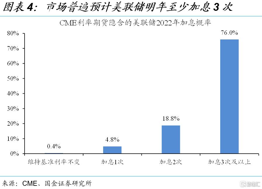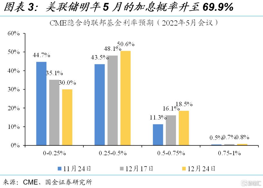 與此同時,市場對美聯儲的加息預期快速升温,短期波動明顯放大。最為市場所熟知的 CME 利率期貨數據顯示,美聯儲明年5月的加息概率接近7成,全年至少加息3次的概率更是高達76%。《華爾街日報》等部分機構的問卷調查顯示,美聯儲明年至少加息1次。受加息預期升温等影響,海外市場波動明顯加劇。