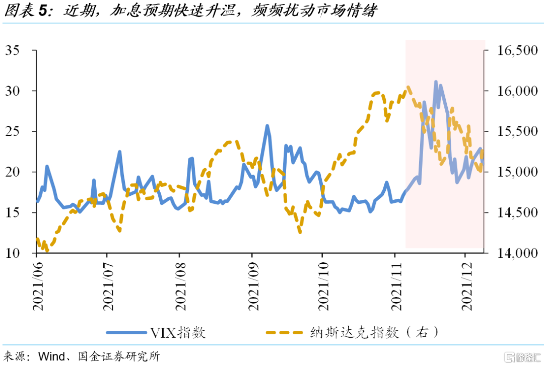 與此同時,CME利率期貨等隱含的加息預期明顯升温,市場波動明顯加劇。作為最為市場所熟知的加息預期,CME利率期貨的數據顯示,美聯儲明年5月的加息概率,由1個月前的55.3%快速升至69.9%。不僅如此,CME“預計”美聯儲明年將加息3次及以上的概率也達到76%。伴隨加息預期快速升温,市場波動加劇,例如VIX指數中樞明顯抬升。