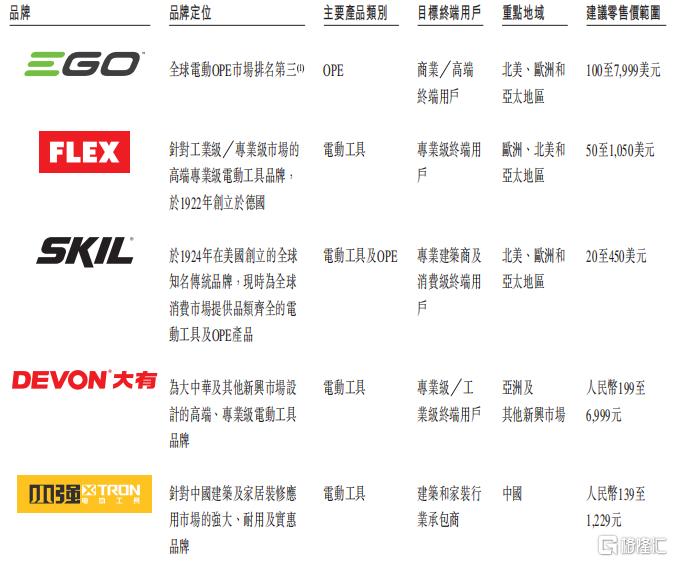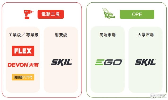 泉峯通過差異化的品牌矩陣覆蓋全球主要地區和細分市場,目前泉峯主要擁有EGO、FLEX、SKIL、大有和小強五個品牌組合。尤其是EGO,自2013年成立以來得到了全球OPE市場的強烈認可,EGO在全球電動OPE市場排名第三(佔有9.8%的市場份額)。EGO主要定位於北美、歐洲和亞太的高端OPE市場,系列產品包括割草機、打草機、鏈鋸及吹風/掃雪機。