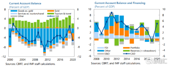 這些政策還導致外部失衡加劇。內需回升支撐了進口,而出口,尤其是旅遊業,遭遇了大幅下滑。較弱的貨幣政策可信度導致黃金進口飆升,增加了經常賬户赤字。土耳其外部融資環境惡化,對短期融資的依賴增加,外國直接投資淨流入放緩以及,在2020年的大部分時間裏,投資組合淨流出。土耳其外匯儲備的結構也有所惡化。