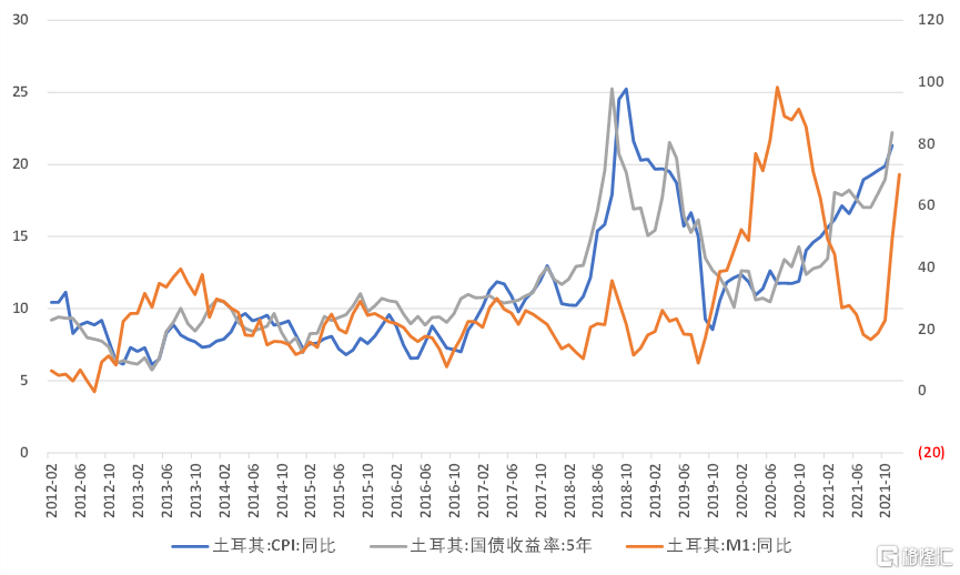 從土耳其金融市場表現來看,土耳其的通脹繼續上行,11月CPI同比錄得21.3%,通脹上行帶動國債收益率同步上行,5年期國債收益率11月錄得22.2%。而土耳其的貨幣投放也在加速上行,12月M1增速錄得70.1%,顯示市場可能在拋售本幣。