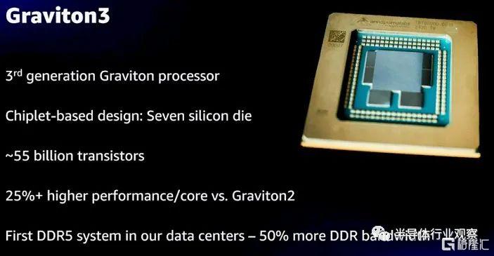 Saidi 的演講比 re:Invent 主題演講詳細得多,實際上展示了 Graviton3 封裝的一個鏡頭,這是我們聽說的小芯片(chiplet)設計。這是顯示 Graviton3 封裝的幻燈片: