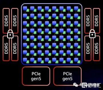 Annapurna Labs 團隊沒有像 AMD 使用“Rome”Epyc 7002 和“Milan”Epyc 7003 X86 服務器芯片那樣擁有中央 I/O 和內存芯片,然後圍繞它的小芯片內核,而是保留了所有 64 個內核在中心的 Graviton3 上,然後斷開與這些內核分離的 DDR5 內存控制器(具有內存加密)和 PCI-Express 5.0 外圍控制器。封裝底部有兩個 PCI-Express 5.0 控制器和四個 DDR5 內存控制器,封裝兩側也各有兩個。(這是第一個支持 DDR5 內存的服務器芯片,其帶寬比當今服務器中常用的 DDR4 內存高 50%。當然,今年其他芯片也會跟進。)