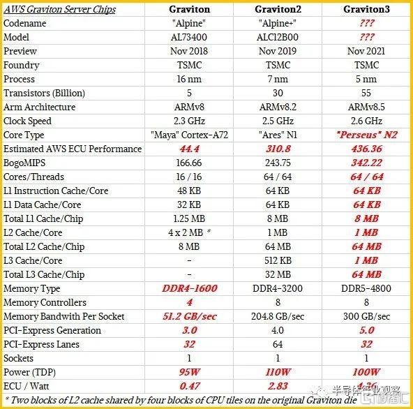 Graviton2 基於 Arm Holding 的 Neoverse “Ares”N1 內核設計的,他們在去年 4 月又發佈了“Perseus”V1 和“Zeus”N2 內核。正如我們已經指出的,與一些人的看法相反,我們認爲 Graviton3 是基於 N2 核心,而不是 V1 核心。AWS 尚未確認正在使用什麼核心。我們做了大量嘗試,試圖去確認 Annapurna Labs 在 Graviton3 中的確使了 N2 核心。我們公開承認,這是一個瘋狂的猜測,因爲紅色粗體顯示的項目是: