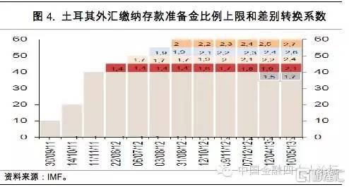 2012年下半年後,歐債危機局勢進一步緩和,外部融資條件改善,資金持續流入。土央行在此期間引入並使用外匯繳存準備金機制與差別轉換系數。在跨境資本湧入時,由於里拉流動性成本較高,美元等外匯利率較低,商業銀行有動機用外匯交納準備金,以獲得額外里拉流動性。央行可以通過提高轉換系數獲得更多外匯儲備。