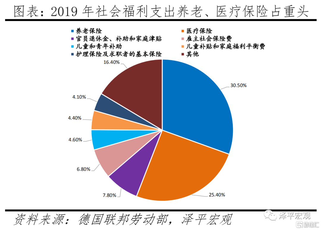 1)建立養老、醫療、護理等五支柱社會保障體系,社保種類豐富、體系完備、強制覆蓋。2020年德國社會保障基金支出佔GDP的23.4%,其中養老保險約佔30%。覆蓋率方面,德國的法定健康保險對個人是強制性的,因此德國的醫保覆蓋了超99%的人口;德國的養老保險也覆蓋了超89%的從業人員。2)多重育兒津貼保障德國家長的工作-育兒平衡,將養育子女視為另一種工作。德國聯邦政府直接發放多種家庭補貼,支出歸屬中央政府預算。其中父母津貼給在家育兒的父母每月收入65%-67%的補貼;兒童津貼給每個孩子每月至少219歐元,至少拿到18歲。3)德國養老金制度注重對家庭的友好性,法定醫療保險與長期護理保險專設人性化的家庭政策。首先,德國計算養老金時考慮養育子女時間,父母每生養一個孩子,月養老金約增加 91.35 歐元。其次,德國的醫療保險、長期護理保險為參保人羣制定了豐富的家庭友好措施,如連帶參保、家庭護理人福利等。4)德國在法律層面引入“外國人融合課程”,開設一系列難民就業引導項目,預計居留十五年後難民就業率達到70%。