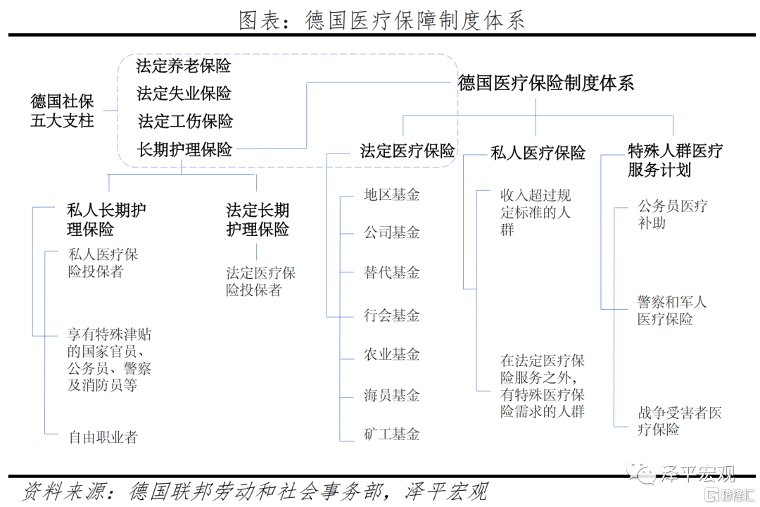 德國建立以法定養老保險、醫療保險、失業保險、工傷保險、長期護理保險的五支柱社保體系,2020年社會保障基金支出佔GDP的23.4%,其中養老保險約佔30%。德國是世界上最早建立社會保障制度的國家,1880年代俾斯麥政府通過了《疾病保險法》、《工傷事故保險法》、《老年和殘障社會保險法》,1911年這三項法律合併為《帝國保險法》標誌了德國社會保障制度的初步建立。1975年德國將各類社會法規彙總頒佈了《社會保障法典》,為當今德國社保打下法律基礎。1995年德國設立了長期護理保險,形成種類豐富、體系完備的五支柱社保體系。從社保支出看,根據聯邦統計局數據,1980-2020年德國社會保障基金支出由1718億歐元增至7790億歐元,佔國民收入、GDP的22.7%、23.4%。德國社保體系中佔據着主導給付地位的是養老保險,2019年養老保險給付佔給付費總額的30.5%,這一比例自1961年起一直呈上升趨勢。1960-2019年醫療保險佔比從14.5%增至25.4%,醫療保險是社保體系的第二支柱。從覆蓋人羣看,德國社保體制的覆蓋面廣,其濃厚的強制性色彩是俾斯麥型保障制度的主要特徵。法定養老、醫療均涵蓋了從業及總人口的90%;而1995年新引入的護理保險則按“護理保險跟從醫療保險的原則”的法律規定強制所有參加醫療保險的人都要投保;而幾乎全體僱員都參加了失業保險和事故保險。從財源看,德國社保籌資以社會為主、以國家為輔,國家主要負責社會救濟等支出,強調個人責任。多數社會保險項目由僱主和投保人平均分攤保費,政府只給予適當的財政補貼,如在養老保險中為五分之一左右。