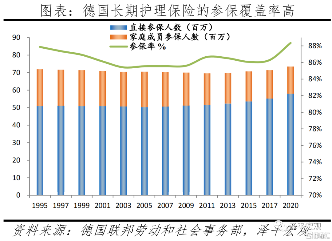 德國通過醫療健康保險和長期護理保險(SLTCI)兩個系統提供全民保險覆蓋,法定健康保險對個人是強制性的,長期護理保險則對已參加醫保的人羣自動覆蓋。德國醫保覆蓋了超99%的人口,1995年SLTCI的參保率也達到了88.03%。德國通過法定健康保險 (SHI) 和私人健康保險 (PHI)兩個系統提供全民健康保險,法定健康保險強制個人參保,除非個人收入超過60,750歐元,這允許他們選擇私人保險。大約 88% 的人口通過疾病基金獲得初級保險,11% 通過私人保險獲得。從功能上看,法定醫療保險提供的醫療福利包括作為病房病人的住院(醫院)護理,由註冊醫生提供的門診護理和基本牙科護理,還可以在其成員因病無法工作期間支付病假津貼;長期護理保險則主要滿足個人護理需求的部分費用,例如嚴重殘疾者的餵養和洗澡等。從制度的覆蓋面看,德國SLTCI儘可能地覆蓋全體居民,尤其是納入高收入的私人醫療保險的參保人。長期護理保險對已參加醫保的人羣自動覆蓋,參保者的配偶和兒童也自動覆蓋;私人醫療保險的參保人必須購買私人長期護理保險(PLTCI),或自願註冊參加SLTCI。1995年制度建立開始,SLTCI的參保率就達到了88.03%,其中29.19%的人是以家庭聯保的方式進入長期護理保險制度,此後的參保率均在85%上下浮動。從財源看,法定醫療保險的資金來自僱員和僱主平均分配的 14.6% 的工資繳款。法定長期護理保險由僱員和僱主平均分攤的 3.05% 的工資提供資金。