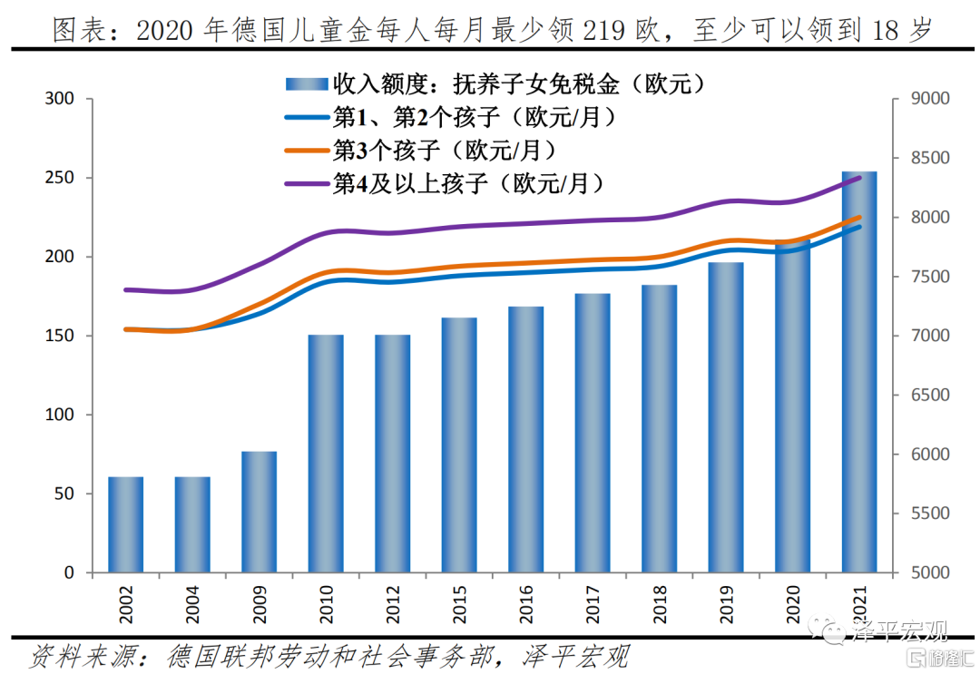 德國通過聯邦政府直接發放津貼來改善家庭的收入狀況,認為養育子女是一種工作,是對有償就業的替代。目的是希望年輕的父母免於經濟壓力安心在家撫養小孩,同時鼓勵本國夫婦多生育。自2003年開始德國成立了“家庭政策聯盟”,德國政府和經濟界齊心合力實施一系列促進家庭人口增長的刺激計劃,共同創造有利家庭的工作環境。在父母津貼方面,1986年,聯邦議會通過了進步派提出的《聯邦養育津貼法》,規定照顧子女者可以在子女出生後領取最長10個月的養育津貼,由州政府或其委託的機構負責實施,聯邦政府承擔津貼費用。2007年起,德國的父母津貼(家長金)大幅上調,以鼓勵雙職工夫婦多生育。停職在家照顧孩子的父母每月可得到税後月收入65%-67%的補貼,每月最高1800歐元。如果父母雙方都休假,總計可以領取最多14個月的補貼,即最高2.52萬歐元。而根據此前的“養育津貼”,新生兒父母兩年裏最多領取7200歐元。在兒童津貼方面,凡德國籍、持德國永居及工作簽證者的子女均可享受兒童金,兒童福利金由德國聯邦勞動司執行,聯邦政府提供資金。2021年德國《家庭救濟法》啟動,兒童金進一步增加,補貼按月發放,同時生的越多,補貼越多。標準為第一胎和第二胎每月219歐元,三胎每個子女225歐元,第四胎及以上250歐元,每個孩子至少可以拿到18歲。據德國《明鏡週刊》,德國聯邦政府承擔各類家庭社會補助的財政支出,每年在約150種家庭津貼上支出超過2000億歐元,包括兒童津貼、兒童福利、教育套餐一次性付款、家庭成員非繳費共同保險等。在2020年,德國政府在各項家庭津貼上的花費已經超過國防支出。