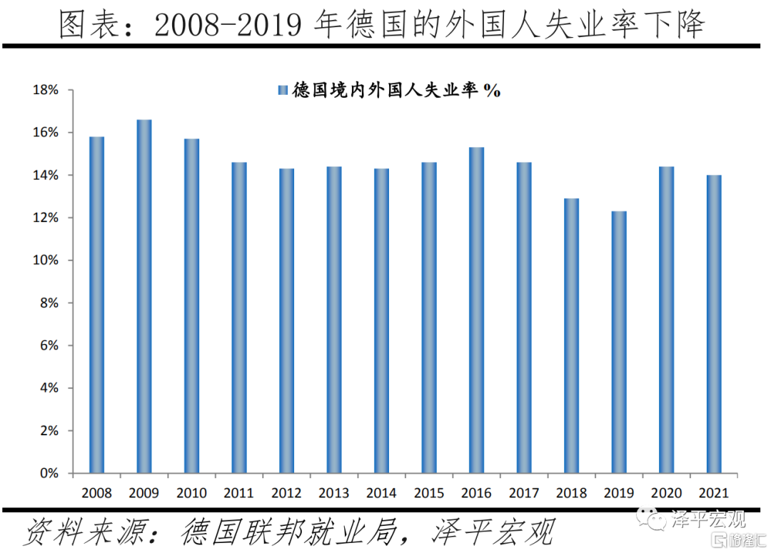 21世紀的難民潮為德國帶來大量潛在勞動人口,同時難民人口結構年輕,老齡人口比重低。德國主要通過職業培訓、靈活調整就業政策提高難民勞動力轉化率。2010年阿拉伯之春爆發、2015年敍利亞、利比亞等中東、北非地區戰亂不斷,疊加阿富汗塔利班、極端組織“伊斯蘭國”猖獗蔓延,使得大批難民不斷向歐洲地區湧入。出於人道主義關切和緩解國內勞動力短缺的考量,德國聯盟黨在難民危機伊始採取“歡迎文化”指導接納政策,2015 年 8 月,德國決定對於來自敍利亞的難民,無論其之前是否經過第三國抵德,都可申請避難。德國難民數量從 2013 年隨着中東戰局的持續升級而出現猛增,到 2016 年達到最高峯,一年內收到的避難申請多達 74.5 萬人。從年齡結構看,湧入的難民還有年輕化的特徵,近三年來進入德國的難民羣體青中年比重極大、老齡人口比重非常低,2016-2018年進入德國的難民 65 歲以上的老齡人口僅佔 0.6%,18-65 歲的勞動適齡人口占比超50%,與老齡化日趨嚴重的德國本土國民形成了鮮明的對比。年輕的難民人口若綜合素質達標,可以直接成為彌補德國勞動力短缺的“援兵”或後備人才。所以從勞動力供給看,難民危機為德國提供了緩解勞動力短缺的機遇,但適齡人口能否轉化為有效勞動人口,還取決於難民的素質和工作技能。因此,在改善難民的就業率方面,德國聯邦勞動局、移民與難民局於2001-2016年開展了一系列“融入與多樣性”,“每個人都有潛能”,“年輕難民在手工業中的前景”等項目,為發掘難民專業工作能力的潛能。並於2016 年 7 月頒佈的《融入法》,規定難民已遞交避難申請滿三個月獲居留資格後,就可以享有獲得求職期培訓的權利。在遞交避難申請滿15個月後,可以獲得職業培訓津貼。根據德國勞動力市場及就業研究所(IAB)研究,2015年有 89 萬尋求庇護者抵達德國。他們大多數來自敍利亞、阿富汗或伊拉克,且年齡在 35 歲以下。僅三年後,其中30.7萬人在德國找到了工作並支付社會保障金。隨着居留時間的延長,五年後該批難民的平均就業率可以達到 50%,十年後可突破 60%,十五年後可達到 70%。