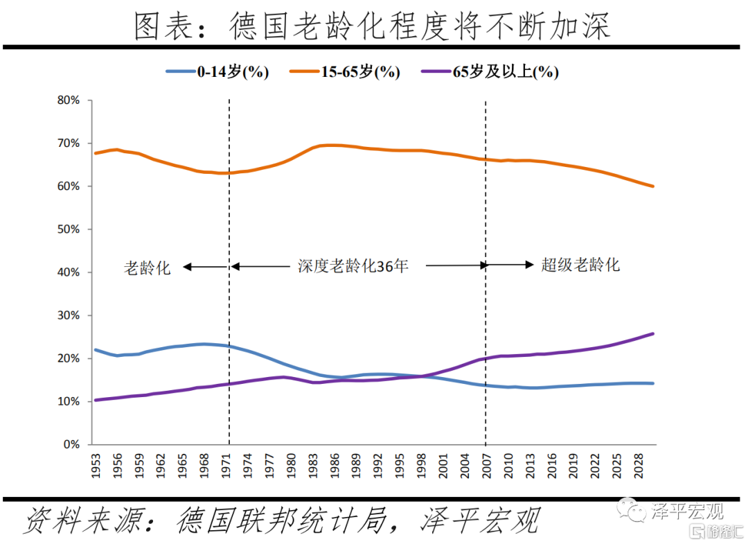 戰後嬰兒潮一代步入退休年齡、預期壽命延長、年輕人口後繼不足促使德國老齡化程度加深。經過36年的深度老齡化,德國在2007年進入超級老齡化社會,1950-2020年人口金字塔形狀由擴張型轉為靜止型,並將在2060年代轉為收縮型。從老齡化程度看,德國老齡化程度不斷加深,人口金字塔正由靜止型轉為收縮型。根據世界銀行數據,1950-2020年德國65歲及以上人口占比由9.7%增至21.9%,高於美國、中國香港、英國、法國的16.6%、18.2%、18.7%、20.8%,老齡化水平居世界第六,預計到2060年該比例將達到28.5%。從年齡中位數看,根據CIA World Factbook數據,1970-2020年德國年齡中位數由34.2歲增至47.8歲,在全球排名第四,稍低於日本的48.7歲,遠高於意法英美中。從老齡化速度看,德國老齡化速度僅次於日本,居西方國家榜首。從65歲及以上老齡人口占比超過7%的老齡化過渡到超14%的深度老齡化,德國用了40年,美國、法國、英國、日本用了65年、126年、46年、24年。同時,受嬰兒潮影響,德國的老齡化趨勢將於2024年開始增速。按照年齡推算,於嬰兒潮期間(1959-1965年)出生的人口將於2024年達到65歲以上,因此德國2024-2030年老齡化程度將迅速上升,從23%增至25.7%,相比2014年-2020年間僅從21%升至21.9%,老齡化年均增速將提升2倍。