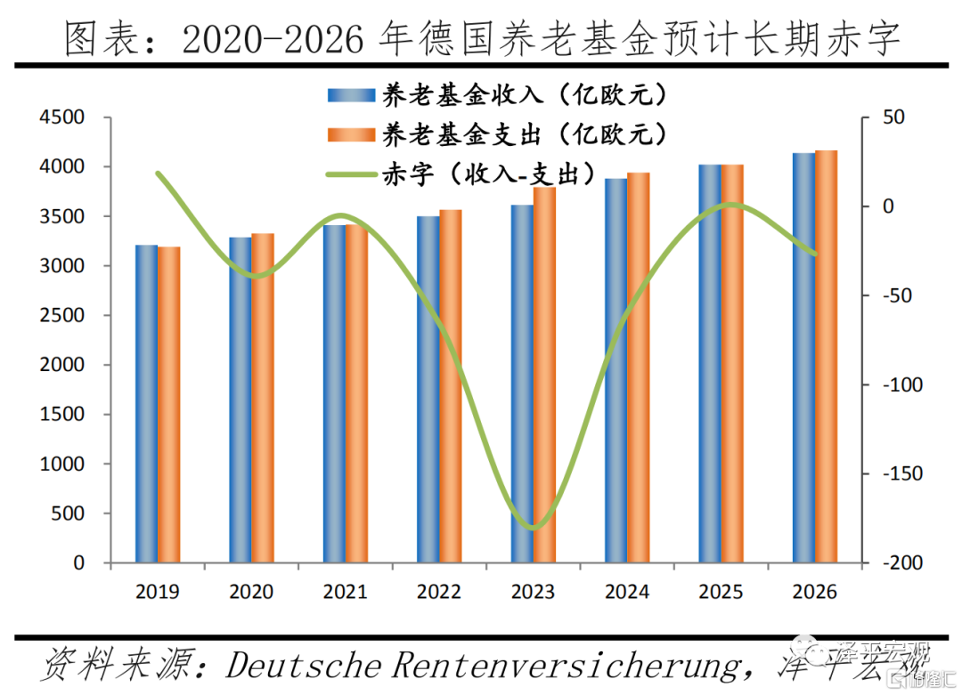 2.當前德國人口困境:老齡化少子化下,高福利社會是德國財政的“雙刃劍”,養老金入不敷出、代際負擔加重。從政府支出看,德國的公共服務、醫療衞生支出等開銷隨老齡化的加重而上升。根據OECD數據,1980-2019年間德國公共社會支出佔GDP比重由22%增至26%;1999-2017年間德國衞生支出佔GDP比重由9.9%增至11.4%。從養老金赤字看,自80年代之後,德國養老保險基金已經處於籌資與給付的兩難困境,2020年德國養老保險基金赤字39億歐元。從財政收入看,1992-2017年間德國個人所得的税收徵收總額增速由25%降至5.7%,勞動人口減少造成的税基短缺是根本原因。