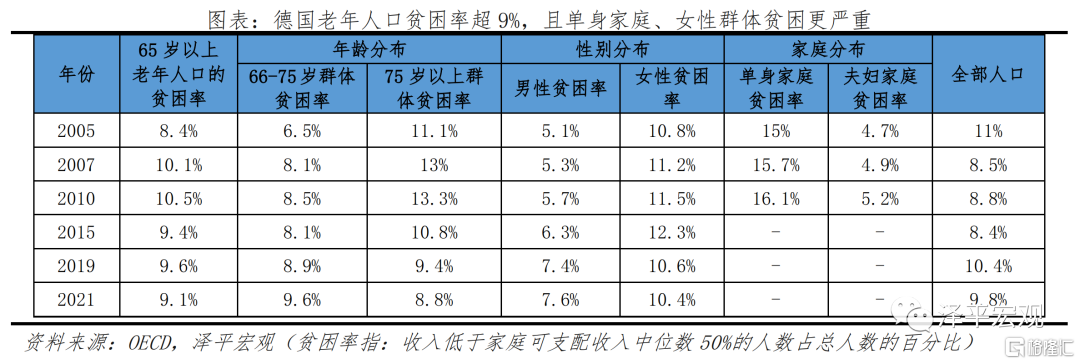 德國人口老齡化過程中的老年女性比重較高、未來單身家庭比例上升,使高齡老年人羣體更容易陷入貧困。2005-2020年間德國65歲以上老年人貧困率由8.4%上升至9.1%。從老年人收入看,退休期收入減少使高齡老年人更容易陷入貧困。20世紀80年代中期,德國65歲以上老年人平均收入相當於全部人口平均收入的82.5%,而75歲以上老年人平均收入僅相當於全部人口平均收入的78.5%。因為受教育水平差異、就業不平等等原因導致女性收入較低,有時她們因為生兒育女和照顧家庭還不得不中斷或停止工作,所以在以薪酬為基礎的養老保險體系中,老年女性比老年男性更容易陷入貧困。在許多OECD國家中,由於就業歧視、退休年齡低、壽命較高 (個別女性因此成為寡婦)等原因,導致老年女性貧困率比男性平均高10個百分點。根據OECD定義的貧困標準,如果一個人的收入水平低於家庭人均可支配收入平均值的50%,那麼就表明其處於貧困狀態。OECD數據顯示2021年德國75歲以上老年人貧困率為8.8%,65歲以上老年人貧困率為9.1%;老年女性貧困率為10.4%,顯著高於老年男性7.6%的貧困率;根據2005-2010數據,老年單身家庭貧困率明顯高於有配偶的老年家庭。人口老齡化特別是高齡化及老年女性比重較高,不僅需要德國政府未來考慮養老金給付時間延長的問題,還需要考慮該羣體的基本生活保障等問題,從制度層面解決他們退休期的收入保障,確保他們的生活水準並有效避免老年貧困。