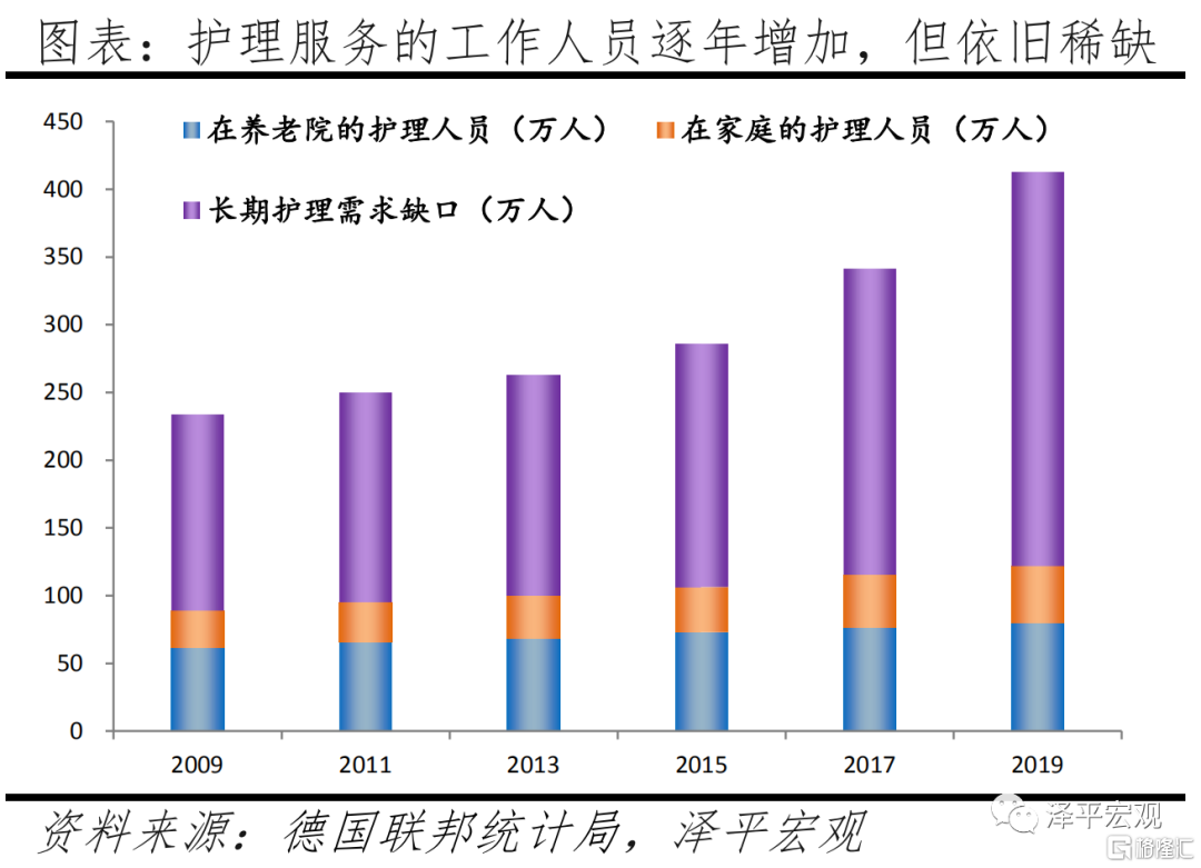 隨着老齡化程度加深,德國依賴護理的老年人羣尤其是嬰兒潮一代需要護理的比例將顯著增加,這對德國政府和私人護理機構來説是巨大的挑戰。據德國聯邦統計局數據,2019年12月,德國有413萬人需要《長期護理保險法》所定義的長期護理,與2017年12月份需要長期護理的341萬人相比,人數顯著增加了71萬人,上漲了21%。隨着新的、更廣泛的長期護理概念被人們所熟知,疊加老齡化加深,需要護理的人數會逐年增加。從參與護理的工作人員數看,德國2017年在養老院的護理員工為76.4萬,在家庭護理中的護理員人數為39萬,合計115.5萬人,遠低於當年需要護理服務的341萬人。從居住地附近的康養設施、醫療機構分佈看,2019年德國有大約67%需要護理的人生活在家庭環境中,並由親戚或提供門診護理服務的專業人員一起照顧。但根據柏林人口研究院統計,德國嬰兒潮一代的76%以上的老人更希望更長時間的保持獨立,並自由地在居住地附近活動,而不是單純的在家中受到照顧。同時,35%的社區老人認為:在步行或承載交通工具短距離出行範圍內,有完善的家庭醫生、醫療用品商店的重要性就越來越高。尤其是在德國東部以及農村地區,醫療分支機構、保健中心的分佈密度不足西部發達區域的60%,專業的護理人員短缺的現象也會隨着老齡化加劇而越發嚴重。