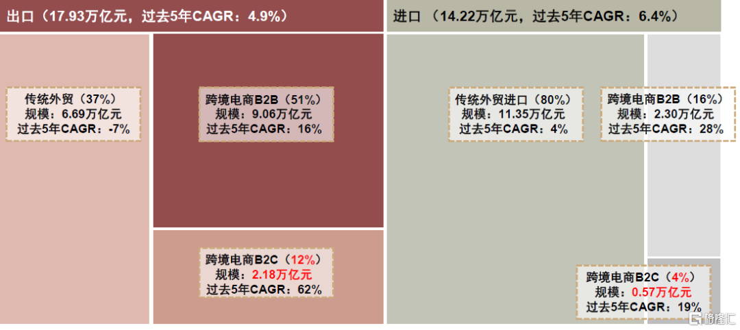 ► 宏觀來看,2021年我國出口增長強勁,1-11月我國總出口總值19.6萬億元,同比增長21.8%。前三季度跨境電商進出口增長20.1%。