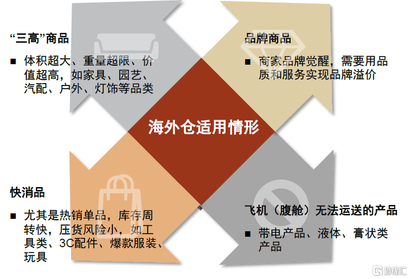 海外倉模式解決了直郵模式在特定場景中的履約難點。首先,針對體積超大、重量超限、價值超高的商品,消費者對履約品質和服務有要求,例如退換貨、售後維修等服務,直郵模式的成本較高,海外倉能更有效地提供這些附加服務;其次,針對電商旺季,直郵空運的時效性和可控性因運力緊缺而變差,海外倉備貨能有效提升旺季履約效率。第三,海外倉模式能打開飛機管制產品的運輸限制:如帶電產品、液體、膏狀產品。