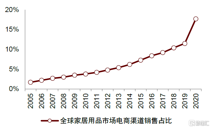 圖表:全球家居用品市場電商渠道銷售佔比迅速提升